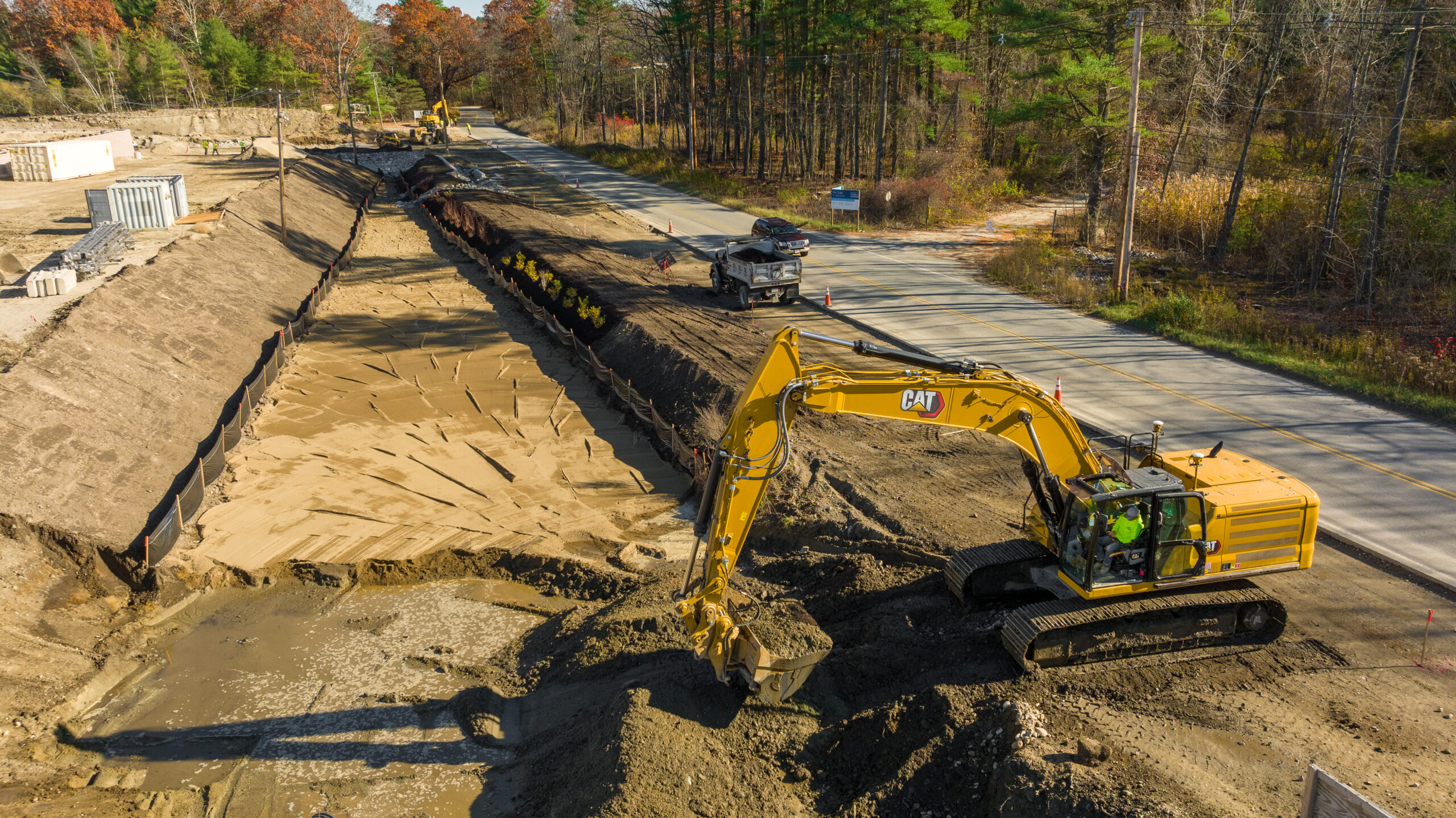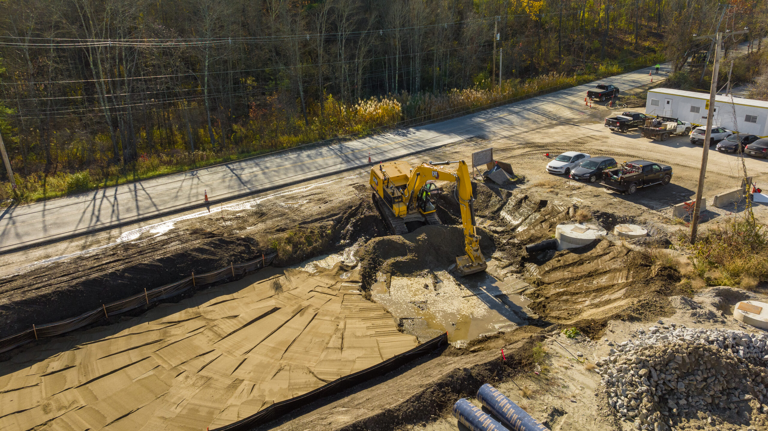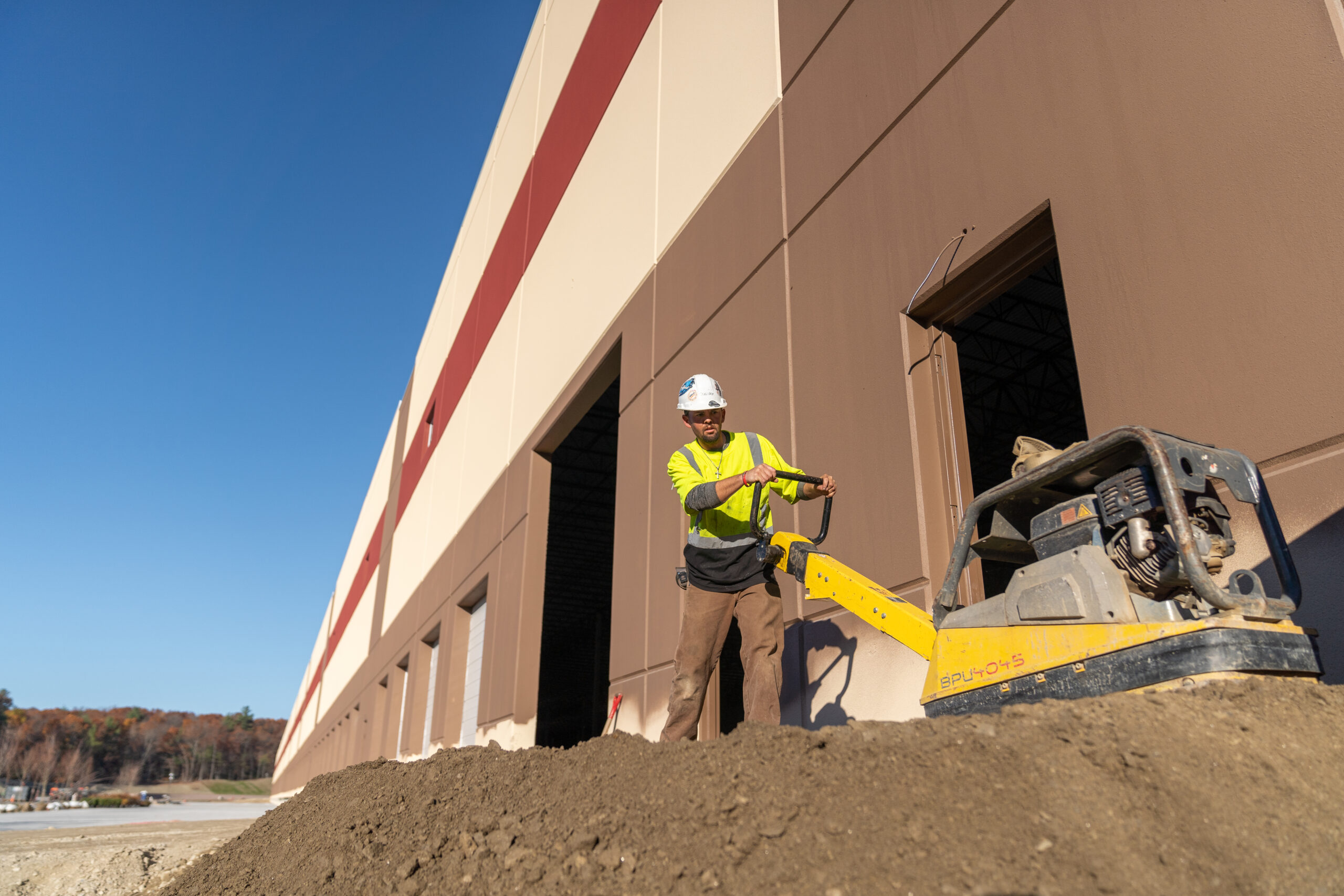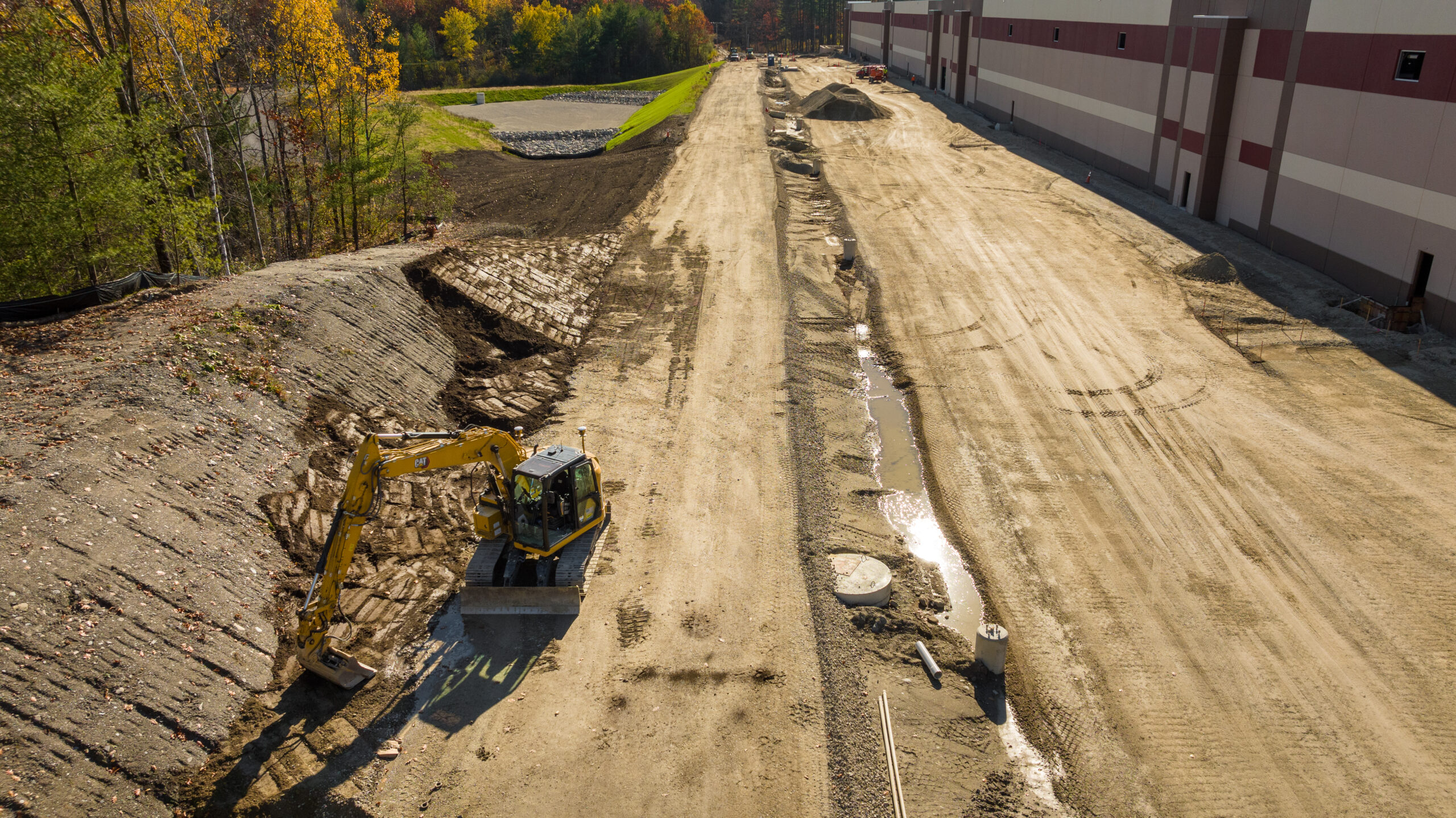 Site excavation and grading for a 372,000 SF warehouse located on a 32-acre site that was previously a pond filled with rubble debris. Work included strategic excavation and dewatering to depths of 40 ft below surface elevations to replace rubble debris and organics with structural fill within the building envelope zone of influence. Major drainage construction components included underground infiltration systems, water quality units, drainage pipe and structures, as well as detention basins. Other site work included tree clearing and grubbing, roadway widening, water line asbestos abatement, site lighting, landscaping, domestic and fire water line piping. Sewer utility work included construction of a large leaching field with associated tanks, pumps, force and gravity mains.