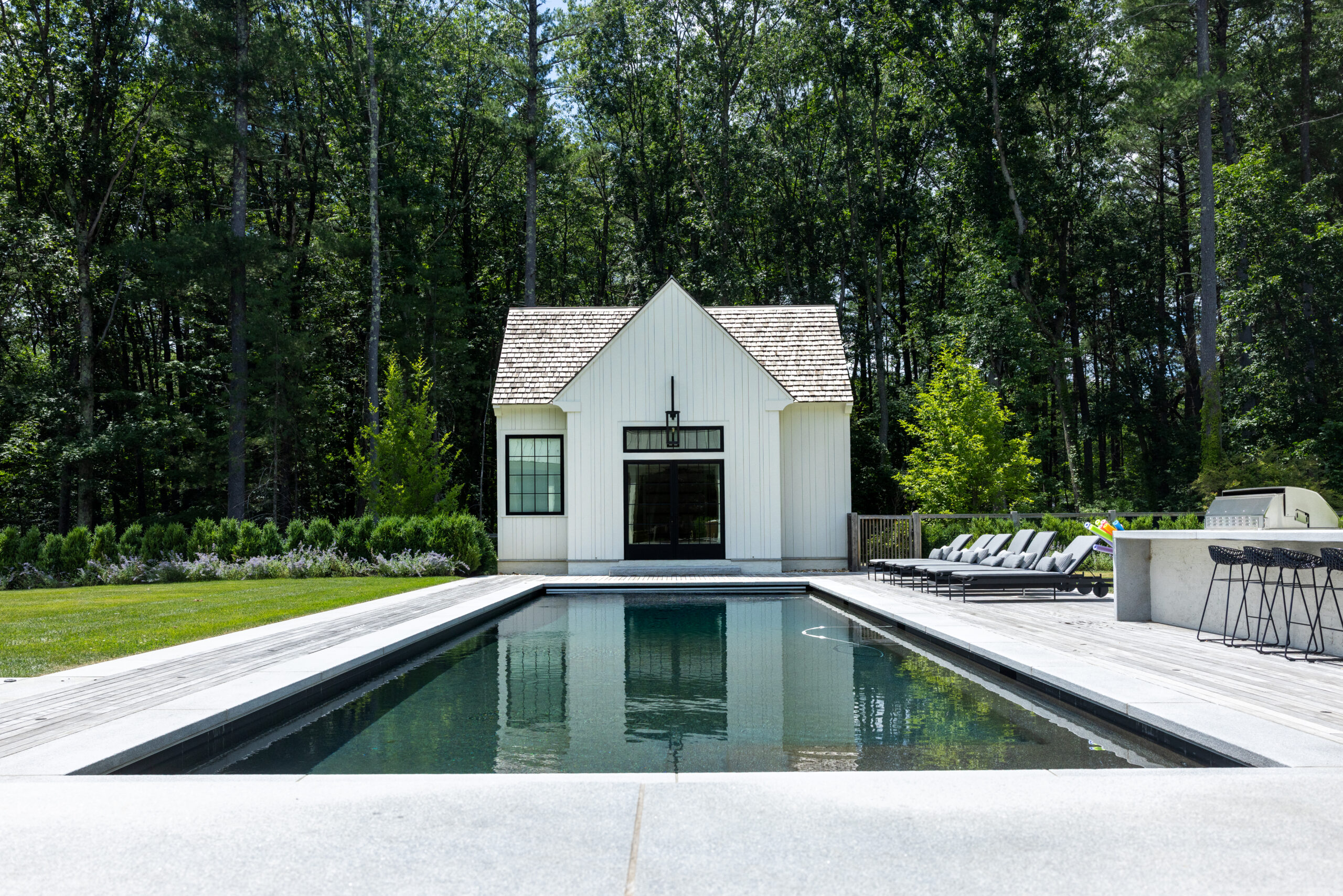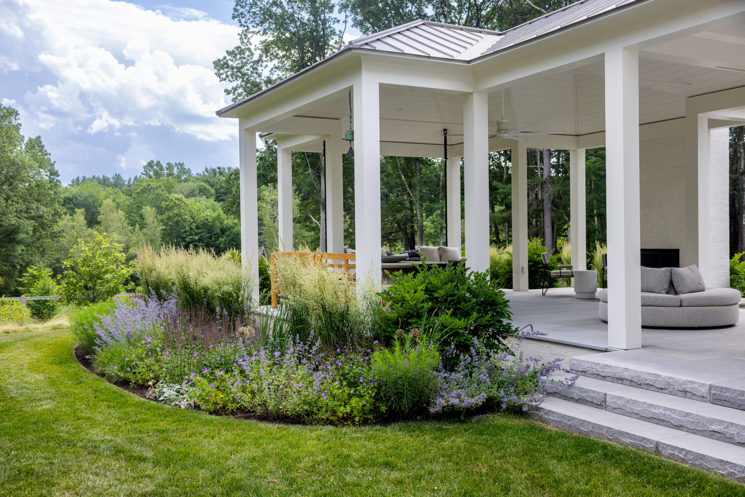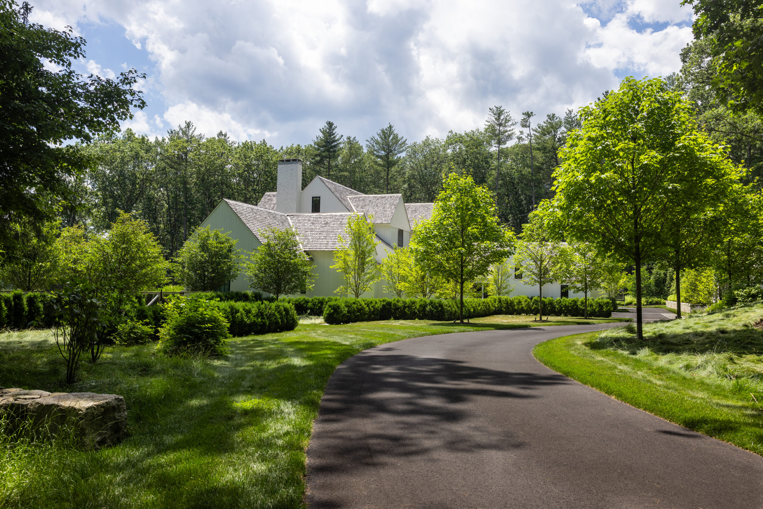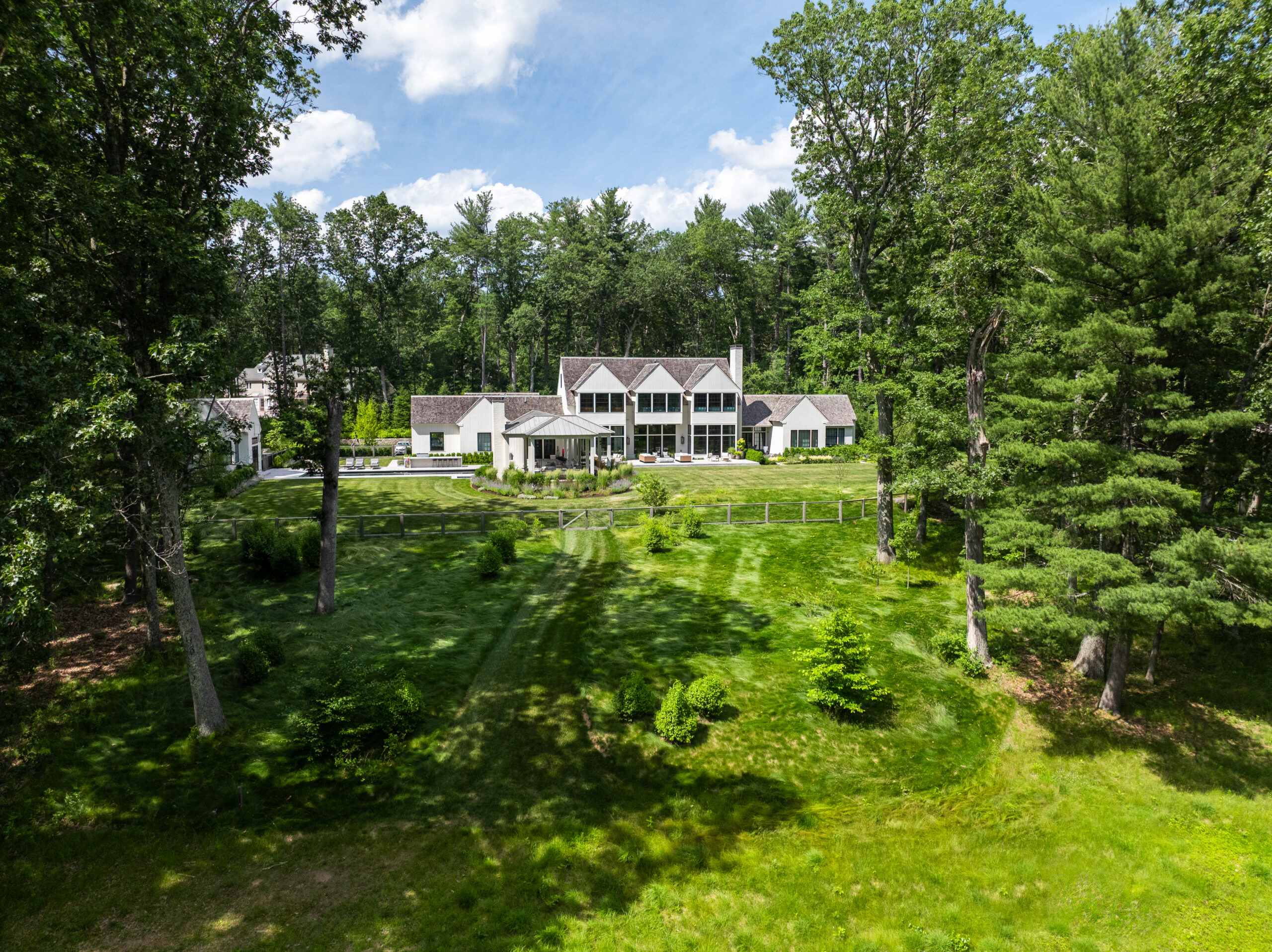 Onyx began work on this project in the Fall of 2022 and tracked to completed Fall of 2023. The project consists of a large landscape scope – new custom pool and spa, granite terraces, walkways and steps, cobble parking court, stone retaining walls. The outdoor kitchen blends both granite and panted brick materials, with a waterfall-edge countertop. There is a huge planting package, mature trees, shrubs and perennials. Onyx also completed the fencing, lighting, lawn and meadow. The site overlooks a pond, care was taken with the site work with this in mind. Matthew Cunningham Landscape Design is the landscape architect, Custom Quality Pools is installing the pool. Fallon Custom Homes is the home Builder and partnered with Onyx to complete this project.