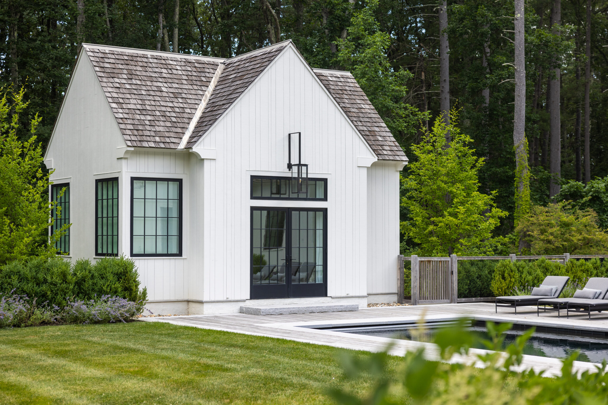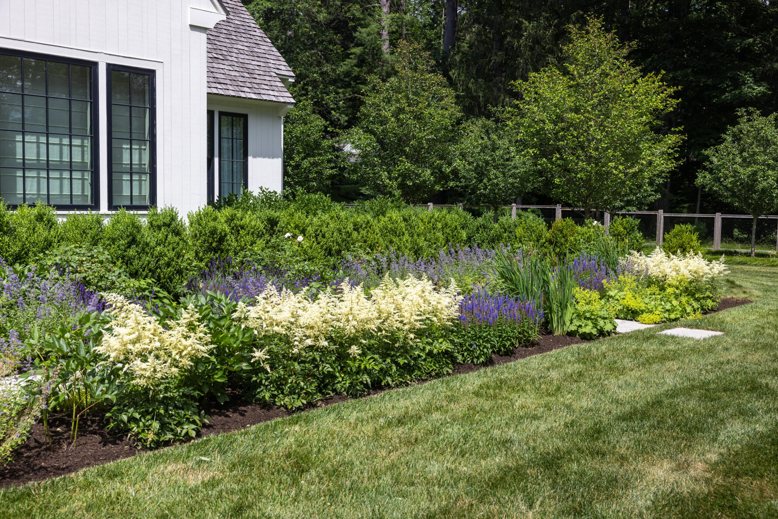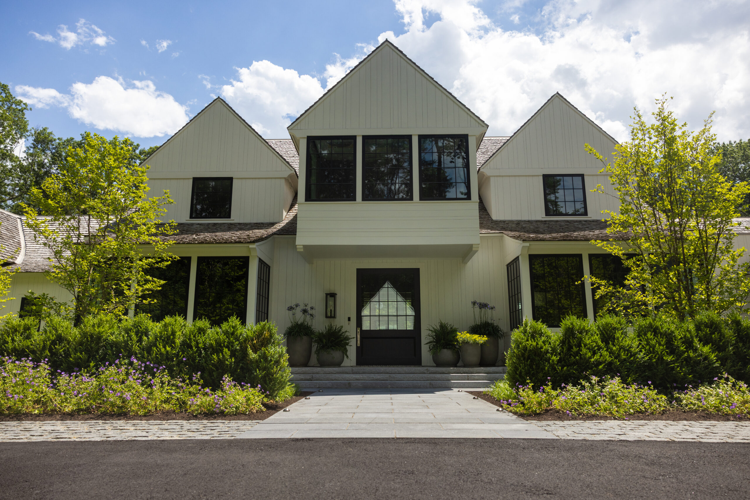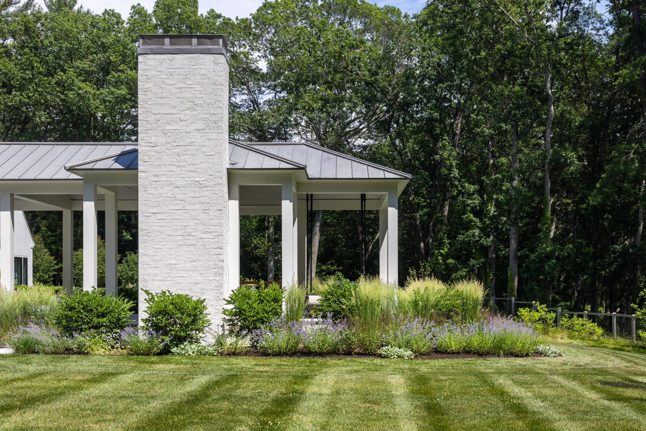 Onyx began work on this project in the Fall of 2022 and tracked to completed Fall of 2023. The project consists of a large landscape scope – new custom pool and spa, granite terraces, walkways and steps, cobble parking court, stone retaining walls. The outdoor kitchen blends both granite and panted brick materials, with a waterfall-edge countertop. There is a huge planting package, mature trees, shrubs and perennials. Onyx also completed the fencing, lighting, lawn and meadow. The site overlooks a pond, care was taken with the site work with this in mind. Matthew Cunningham Landscape Design is the landscape architect, Custom Quality Pools is installing the pool. Fallon Custom Homes is the home Builder and partnered with Onyx to complete this project.